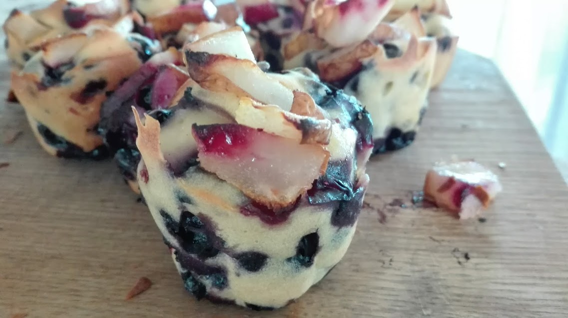 Deși astăzi suntem pe fugă, pentru că vrem ca diseară să campăm, nu ne-am îndurat să plecăm cu atâtea afine în stare crudă, așa că am făcut încă 2 varietăți delicioase: brioșele cu afine, pere și iaurt de capră și un buckle improvizat (deoarece am avut la dispoziție doar tava de cuptor.