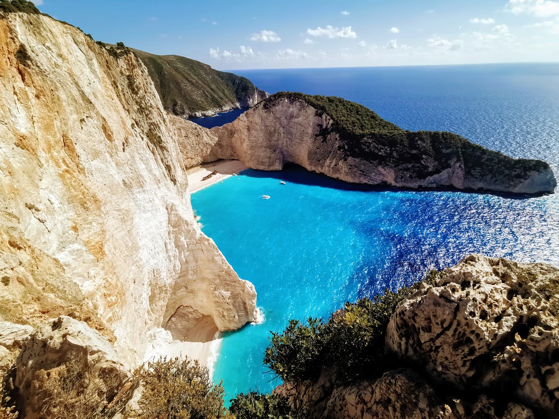 Sigur că nu pot începe cu o alta decât cu plaja Navagio, una dintre cele mai fotografiate plaje din Grecia, pe care am vizitat-o în ultimele zile. Mașina se poate parca în apropiere, după care urmează un scurt traseu de-a lungul stâncilor foooarte abrupte. Noi am pornit pe traseu pe rând, pentru că puiul Călin adormise în mașină. Așa că am pornit cu Carol să găsim frumoasa plajă. Imaginea ne-a izbit cu un turcoaz tulburător de limpede, epava mândră din mijlocul nisipului și stâncile de un alb greu de cuprins cu privirea. Pentru doritori, plaja este accesibilă cu barca mică, cu care se pornește din Porto Vromi, o dată pe oră.