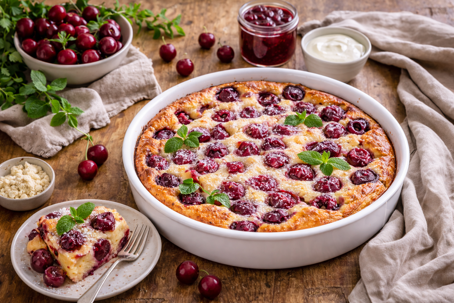 *Dacă nu ați mai făcut clafoutis, să știți că textura finală nu este de chec și nici de pandișpan. Este mai apropiată de o cremă coaptă, cu margini ușor ferme și mijloc moale, aproape tremurat când îl scoateți din cuptor. Se mai așază pe măsură ce se răcește.