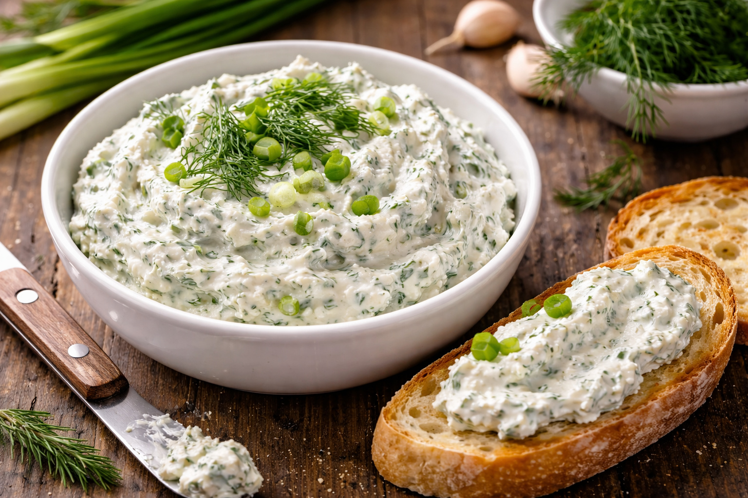 Amestecă crema de brânză cu smântâna până obții o textură fină și ușor aerată. Adaugă verdețurile, sare după gust și omogenizează bine.
