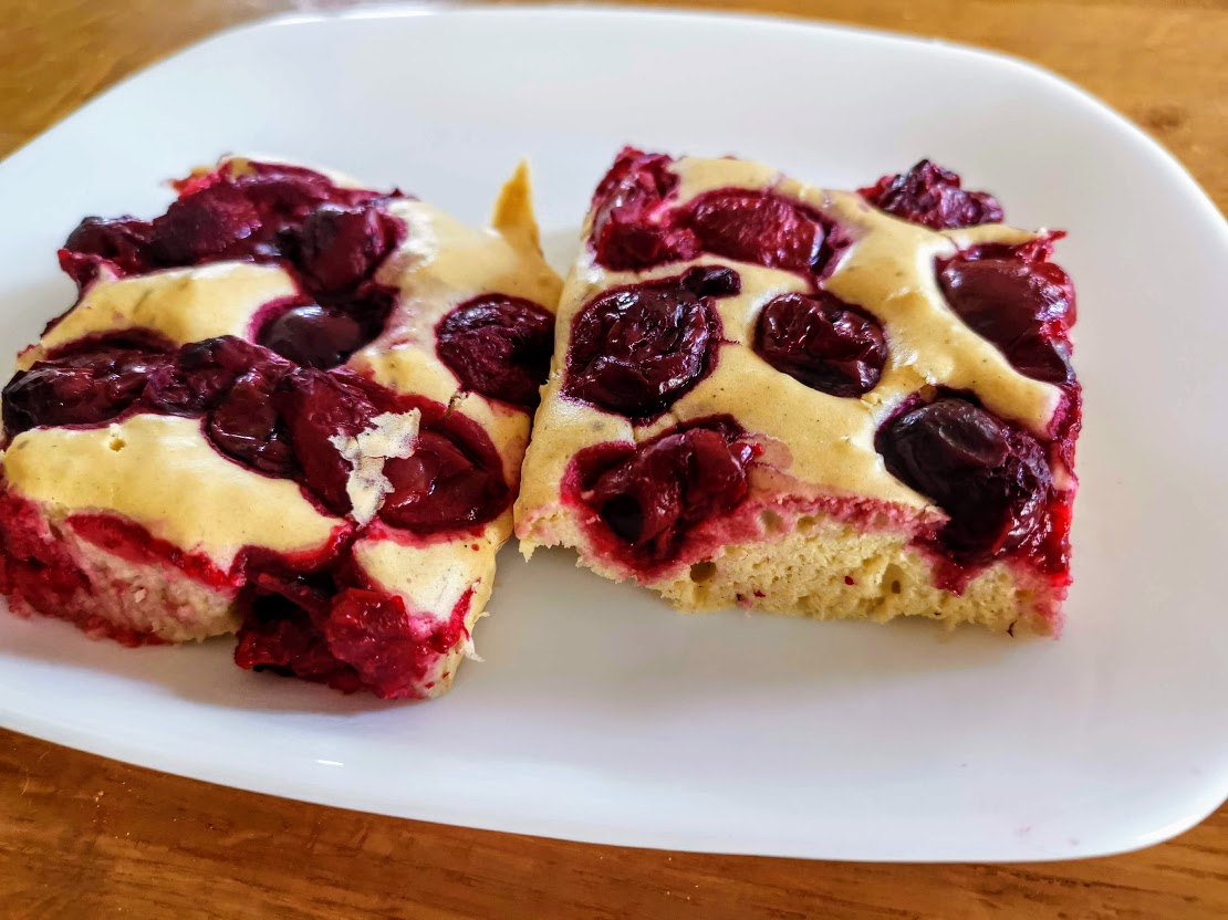 Nu prea am reușit să gust mare lucru, pentru că cei mici au tăbărât chiar și pe porțiile noastre, dar este un desert satisfăcător chiar și pentru un adult. Gustul este dulceag-acrișor, textura moale și aerată, singurul lucru cu care nu prea mă împac atunci când nu folosesc deloc zahăr este mirosul ușor de ou copt, care nu rămâne acoperit complet de aroma vaniliei și a vișinelor. În orice caz, dacă plănuiți să o faceți pentru un festin de adult, vă recomand să folosiți 2-3 linguri de zahăr de cocos, este suficient pentru o prăjitură cu atâtea fructe. Noi nu am folosit deloc de această dată.