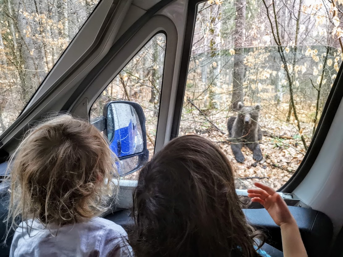 Ne-am îndreptat apoi spre zăpadă, în județul Harghita ningea ca în povești. Aici am avut și surpriza zilei: un pui de urs de aproximativ 2 ani stătea curios pe marginea drumului! Am stat să îl admirăm vreo jumătate de oră, timp în care entuziasmul copiilor a atins cote maxime. Ne-am despărțit cu greu și am ajuns în parcarea generoasă a sitului Natura 2000 ce cuprinde Tinovul Mohoș și Lacul Sf. Ana.