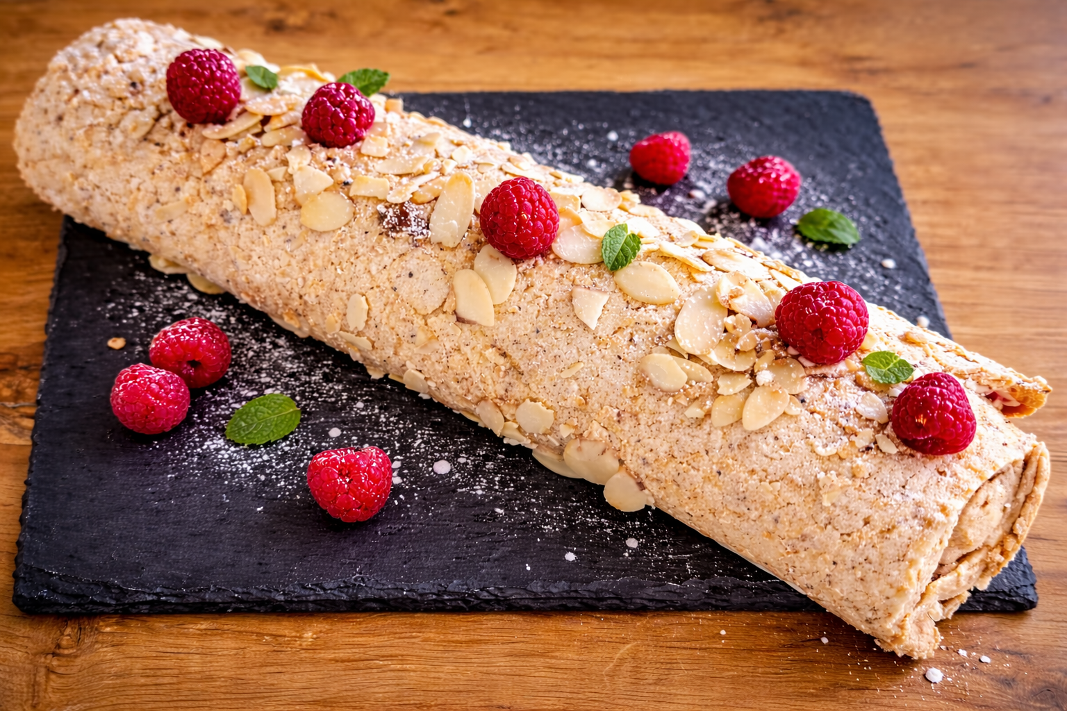 Îmi place rețeta asta pentru că pornește din ceva simplu – albușuri rămase – și ajunge să arate ca un desert de cofetărie. Nu este complicată, dar are acel efect de wow când tai prima felie și vezi stratul roz de cremă printre migdalele aurii.