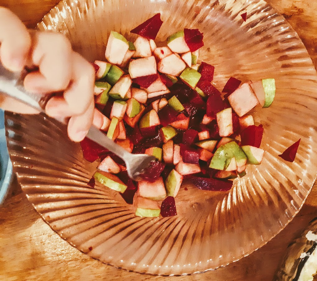Copiilor mei le place tare sfecla. Așa că am fost tare încântată atunci când într-una din cărțile pe care le citim - Cum crește grădina mea de Gerda Muller - am găsit o idee de salată super simplă, pe care am adaptat-o imediat în bucătăria noastră. Puteți să o preparați chiar împreună cu copiii, și poate fi atât mic dejun, cât și garnitură pentru prânz, cât și cină. Nouă ne place să o mâncăm seara, în combinație cu încă o salată. Dacă aveți sfecla deja fiartă și vidată, este o idee bună și pentru camping sau picnic.