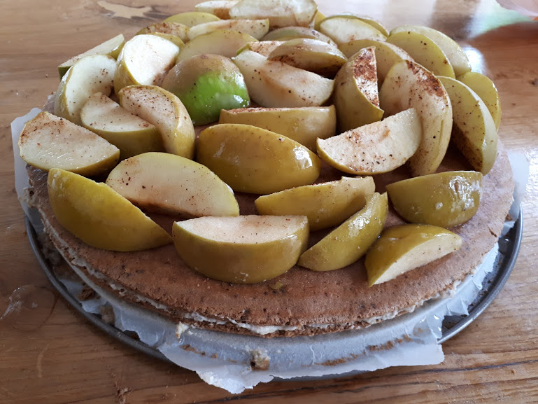 Se întinde bine pe primul blat crema de mere și se acoperă cu celălalt blat, pe care îl puteți însiropa și când îl așezați deasupra.