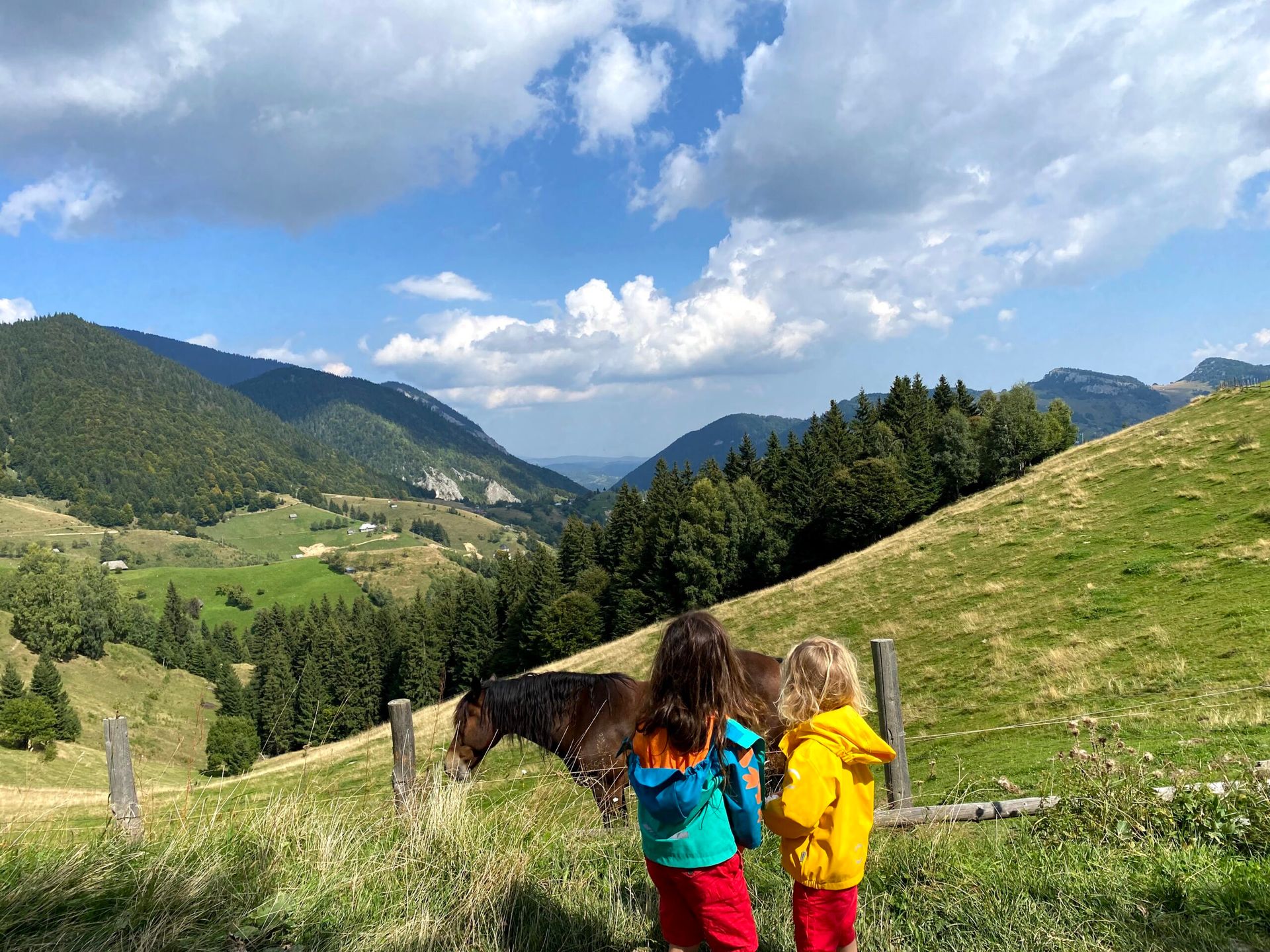 Casele sunt răsfirate pe dealuri, multe efectiv aruncate undeva între pajiști, fără garduri agresive sau construcții masive. Mult spațiu, multe animale, mult aer. Pentru copii este un teren perfect de explorare, cu condiția să păstrați limitele de siguranță de bun-simț.